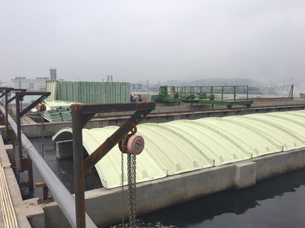 3、輕質(zhì)高強(qiáng)、安裝方便:玻璃鋼集氣罩比重僅為鋼制品的1/3至1/4,固化程度高,載荷負(fù)重大,強(qiáng)度高,適用于大跨度池體,同時蓋板可分為若干小塊,便于運輸、安裝。